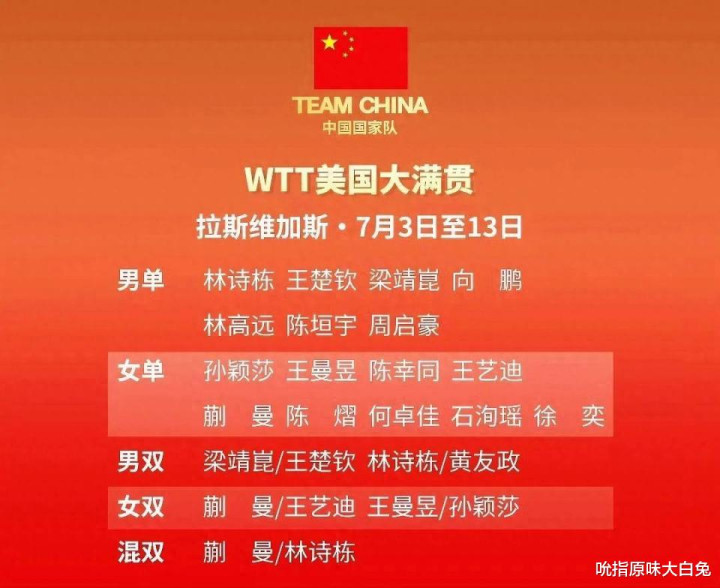 接下来WTT美国大满贯赛来了,7月3日到13日,其中正赛从7月6日开始。WTT美国赛时间表出炉,球迷喜忧参半,喜的是终于能看到国乒主力的比赛了,孙颖莎、王楚钦、王曼昱、林诗栋等人能取得什么成绩,备受关注。忧的是因为时差的原因,不少比赛需要熬夜,凌晨3点多有不少比赛,好在早上9点也有不少比赛。